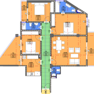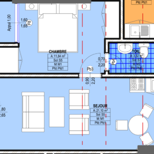 Cet appartement inclut une chambre principale avec baignoire, deux chambres secondaires partageant une douche, un séjour, une toilette visiteur, et une cuisine traditionnelle. La fibre optique est disponible dans le séjour et la chambre principale.